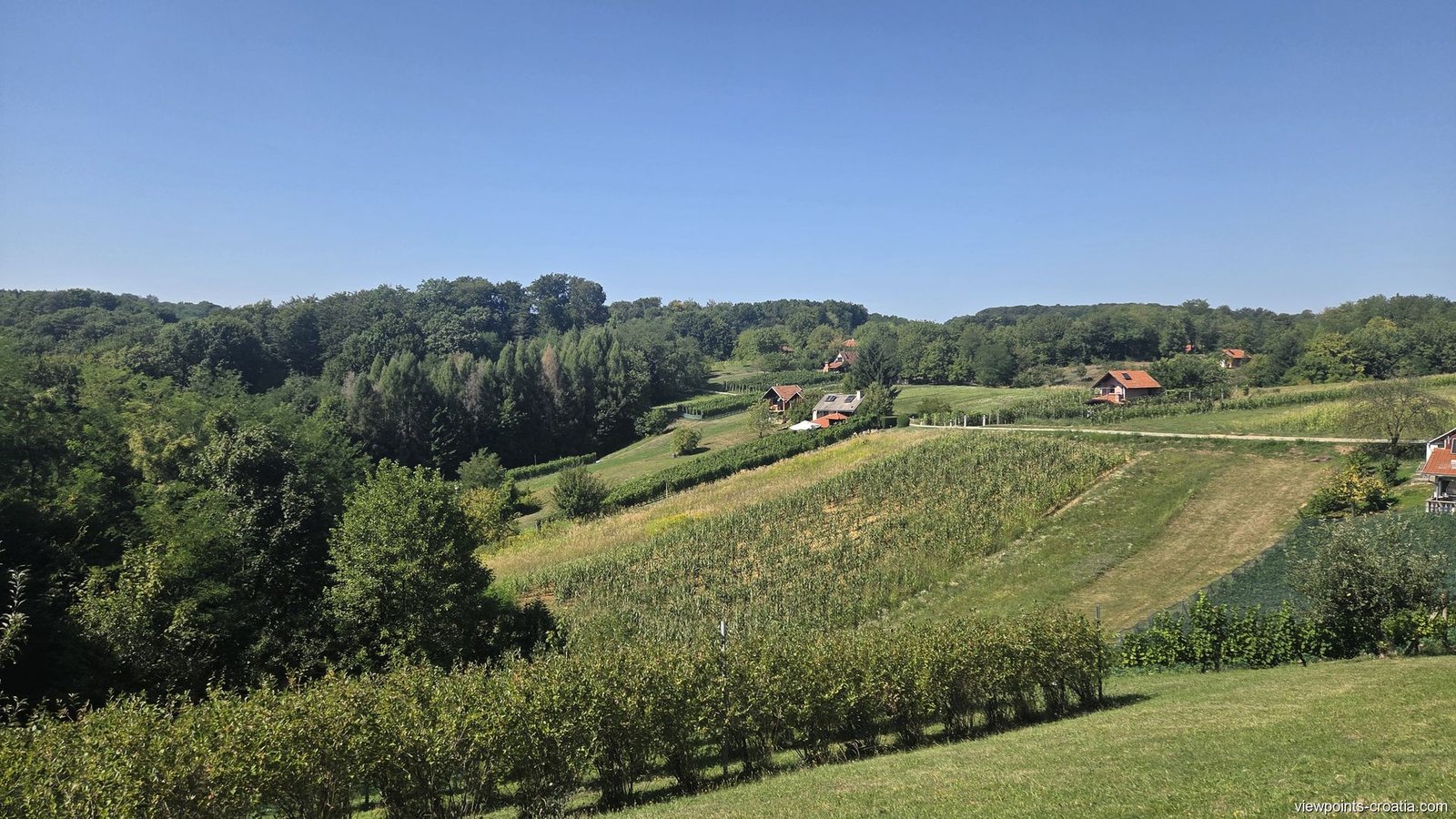 🌿 Kontrast polja i šuma te vijugavih seoskih cesta ispod; mirni, slojeviti horizonti tipični za Hrvatsko Zagorje.