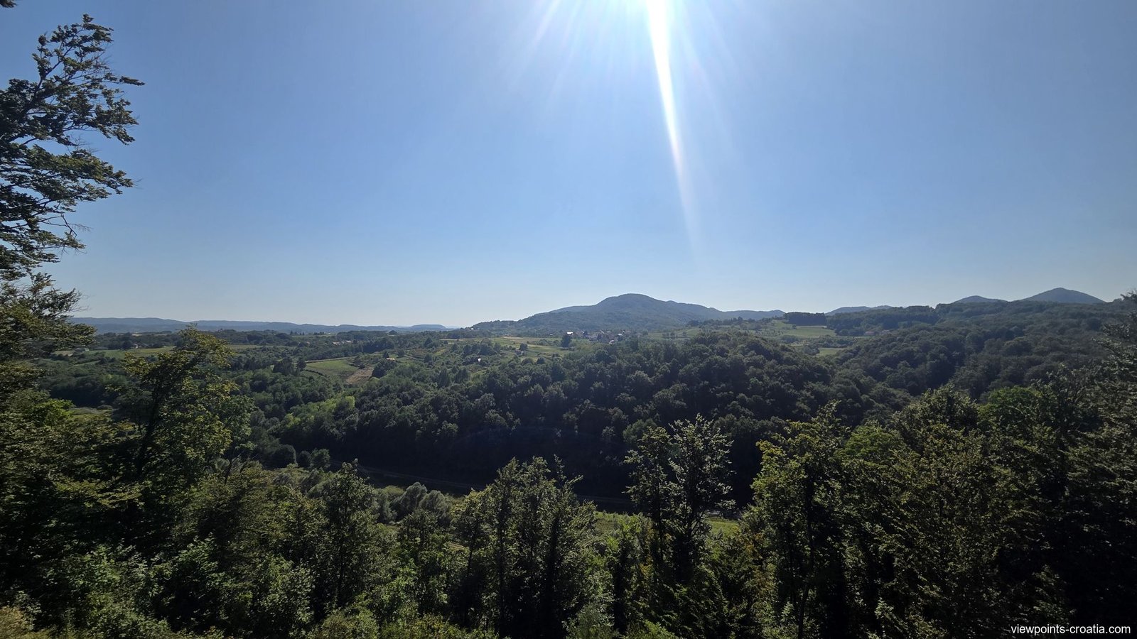 🌳 180° panorama zelenih brežuljaka i raspršenih zaselaka na suprotnoj padini.