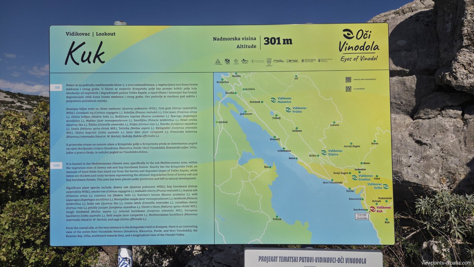 The Kuk Viewpoint is easily reachable via the scenic road connecting Drivenik and Bribir. From Rijeka or Crikvenica, it’s about a 40-minute drive through winding mountain roads. From Zagreb, take the A6 motorway toward Rijeka, then follow signs for Crikvenica and Bribir. From Dalmatia, the best route is through Novi Vinodolski, climbing gently toward the inland hills.
